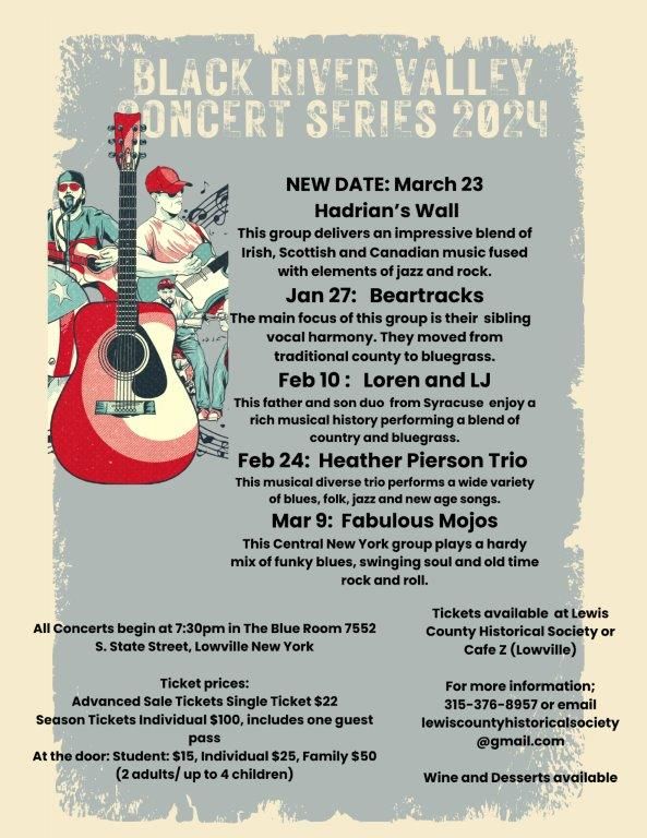 For almost 20 years, the Lewis County Historical Society has sponsored and put on the Black River Valley Concert Series – a set of Saturday-evening musical performances that take place through the winter months at the Historical Society’s beautiful “Temple” on State Street in downtown Lowville.
